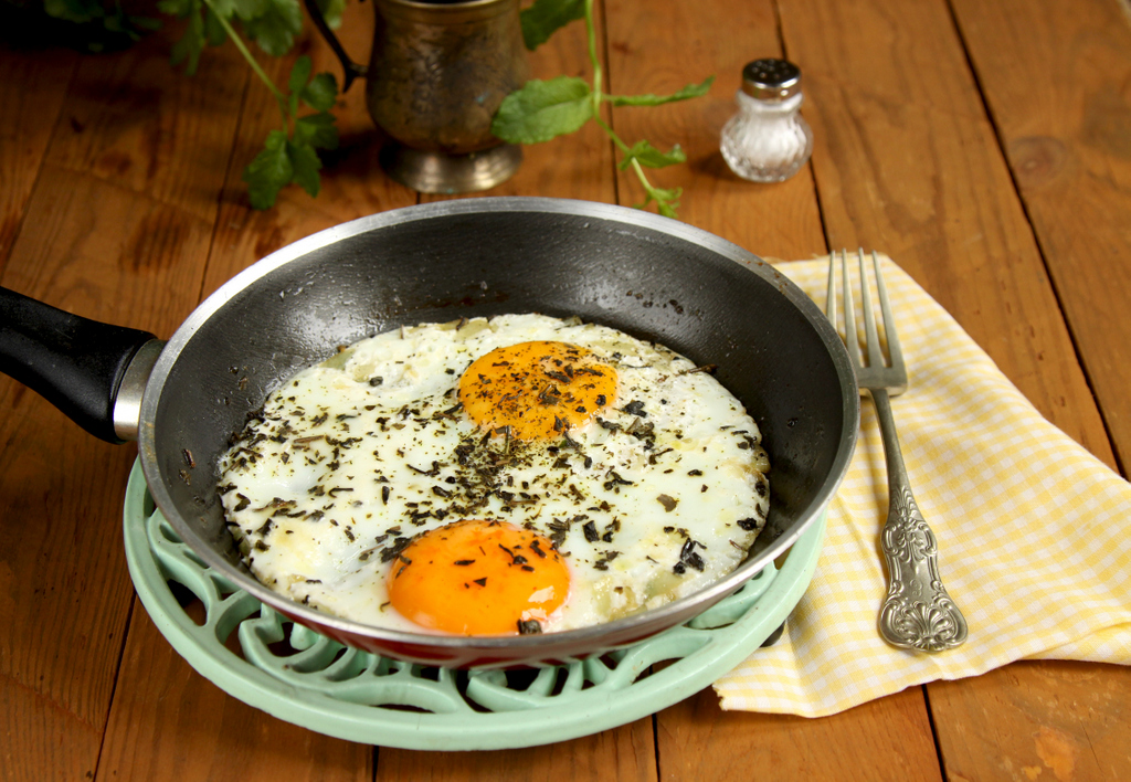 Na patelni rozgrzać masło, przesmażyć na nim drobno posiekany czosnek, należy uważać, aby się zbytnio nie przyrumienił, ponieważ wtedy będzie gorzki. Dodać sok z cytryny i chwilę smażyć cały czas mieszając. Delikatnie wbić jajka, aby żółtka się nie rozlały. Jajka oprószyć solą i pieprzem oraz rozgniecioną w dłoniach suszoną miętą (ewentualnie drobno posiekaną świeżą). Smażyć jeszcze chwilę (najlepiej pod przykryciem), aby białko się ścięło, a żółtka były płynne. Natychmiast podawać.
